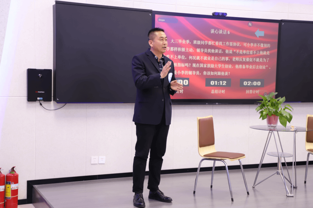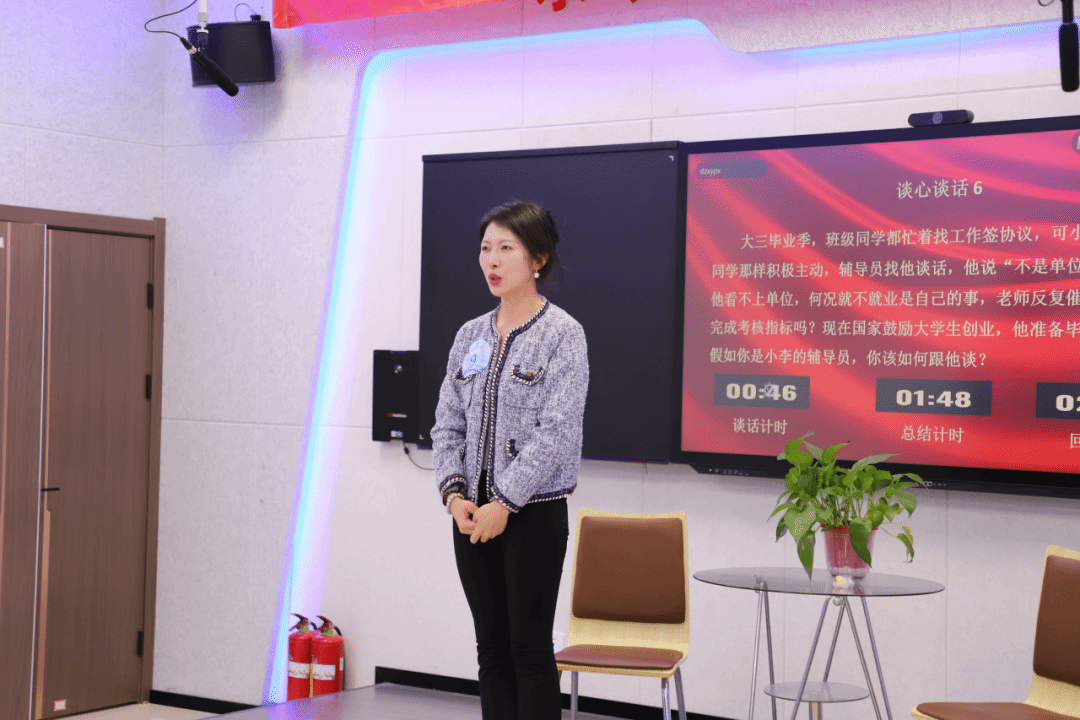“谈心谈话”环节再现了辅导员日常工作的情景,就学生日常管理中可能发生的相关问题开展谈心谈话。参赛选手表现精彩、妙语连珠,面对复杂的学生问题能够快速找到问题本质,及时理清工作思路,准确提出解决方案,帮助学生化解一个又一个“难题”,展现了对学生的教育引导能力、解决实际问题的能力。