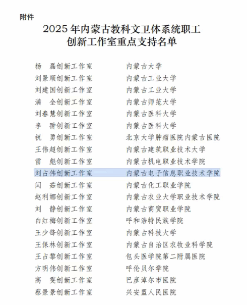 近日,内蒙古自治区教科文卫体工会印发《关于内蒙古自治区教科文卫体系统2025年重点支持的职工创新工作室的通报》,我校刘占伟职工创新工作室凭借扎实的创新基础、突出的技术优势与良好的发展潜力,成功入选。