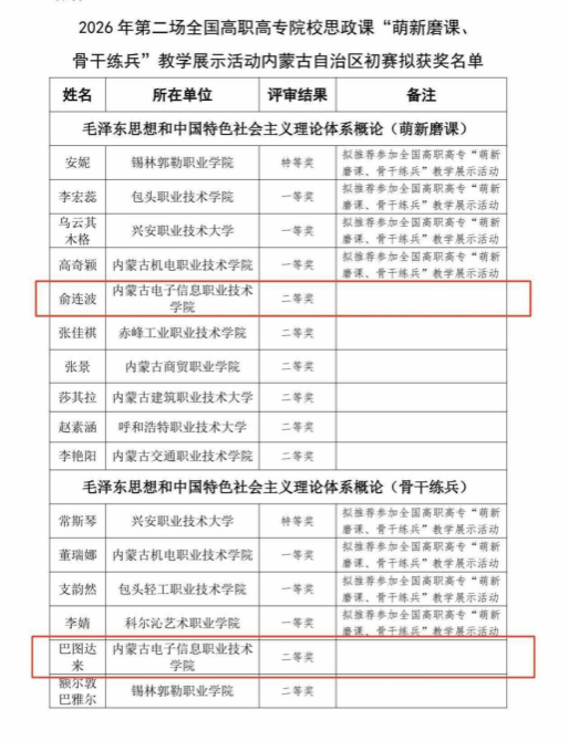近日,自治区高职高专院校思政课教学展示活动评审结果公布,2026年第二场全国高职高专院校思政课“萌新磨课、骨干练兵”教学展示活动内蒙古自治区初赛圆满落幕。经各高职高专院校初选推荐、自治区复赛严格评审等环节,共评选出特等奖2名、一等奖6名、二等奖11名。我校马克思主义教学部俞连波老师、巴图达来老师分别荣获本次活动“萌新磨课”组别、“骨干练兵”组别二等奖。