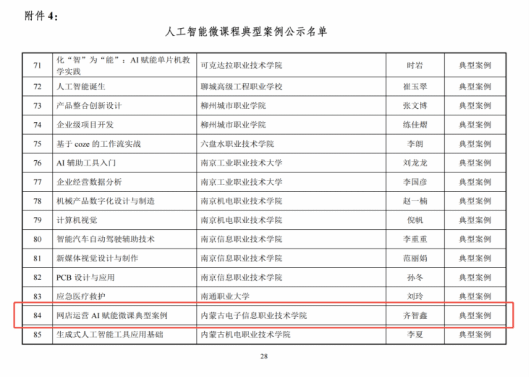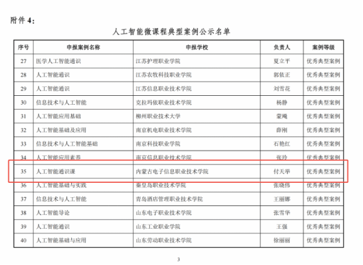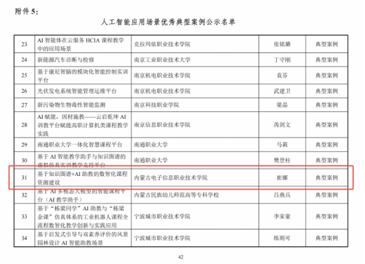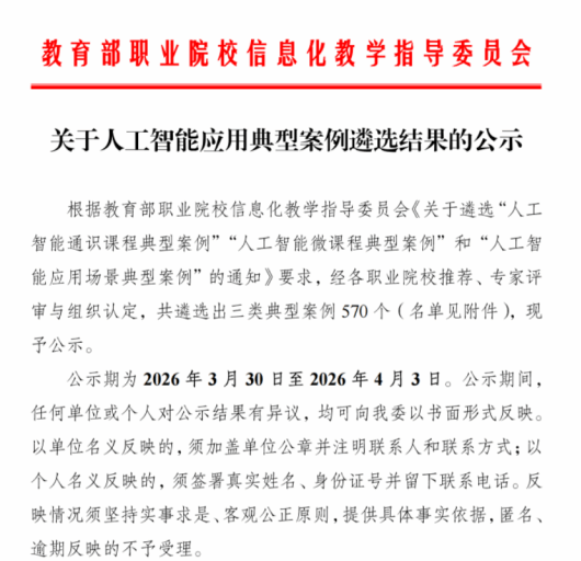 根据教育部职业院校信息化教学指导委员会发布的《关于人工智能应用典型案例遴选结果的公示》,我校《人工智能通识课》获评“人工智能通识课程优秀典型案例”,《网店运营AI赋能微课典型案例》获评“人工智能微课程典型案例”,《基于知识图谱+AI助教的数智化课资源建设》获评“人工智能应用场景典型案例”。