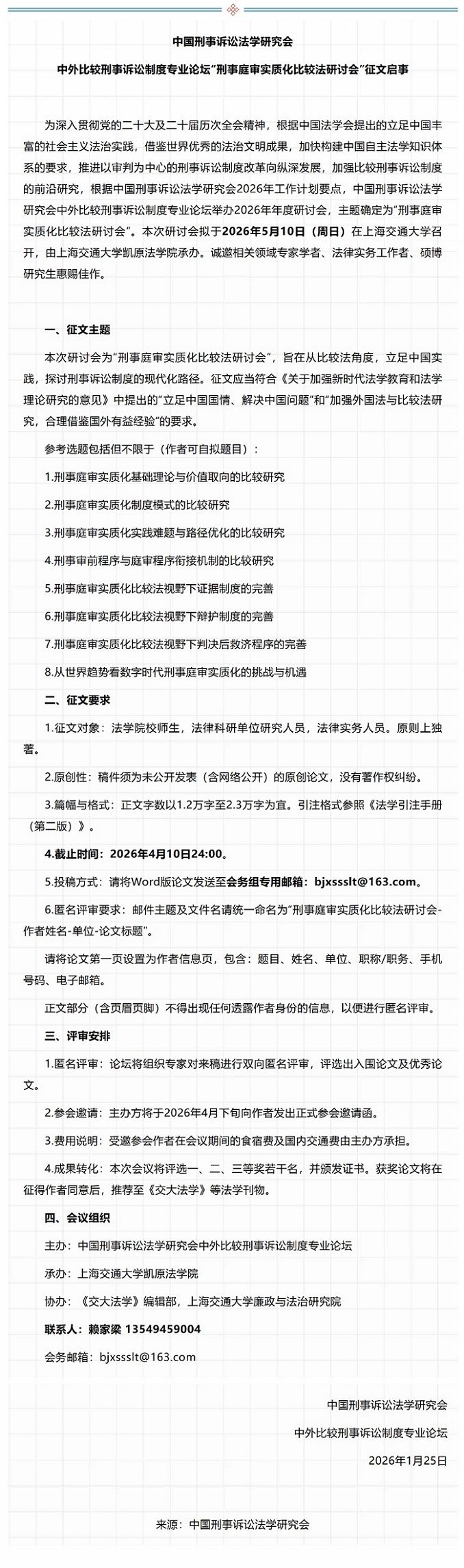 征文启事 | 中外比较刑事诉讼制度专业论坛“刑事庭审实质化比较法研讨会”征文启事