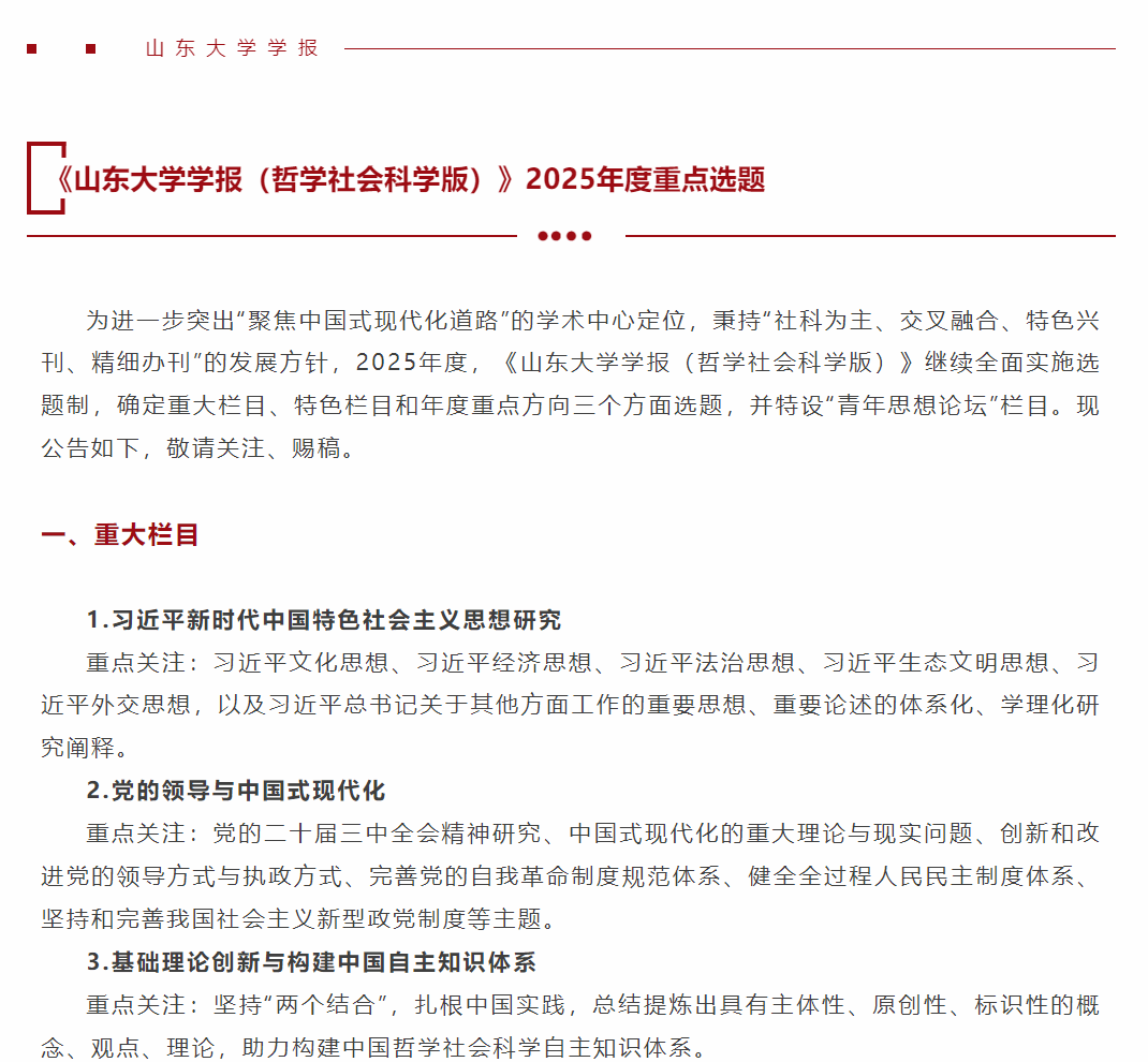 征稿通知 | 《山东大学学报(哲学社会科学版)》2025年度重点选题