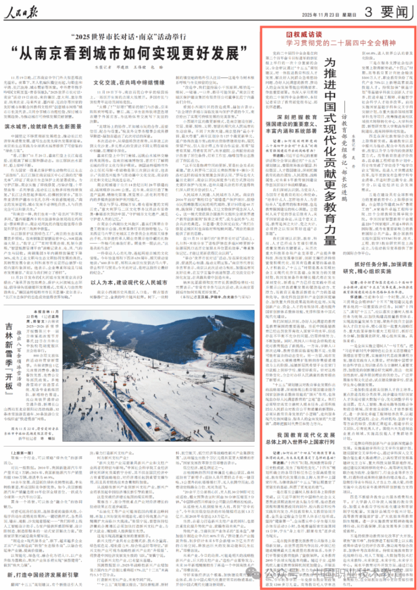 11月23日,《人民日报》“权威访谈•学习贯彻党的二十届四中全会精神”栏目采访教育部党组书记、部长怀进鹏。跟小编一起来看——