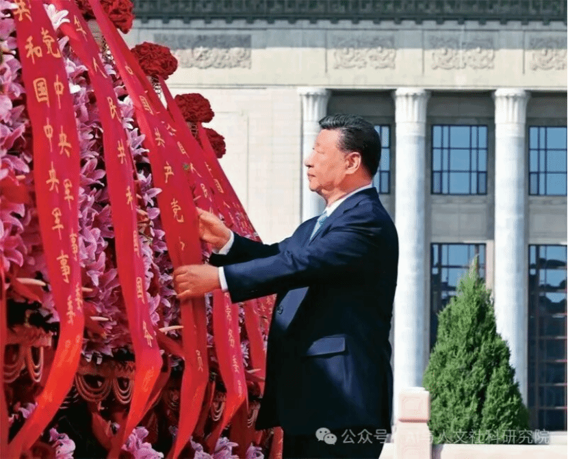 2025年9月30日上午,党和国家领导人习近平、李强、赵乐际、王沪宁、蔡奇、丁薛祥、李希、韩正等来到北京天安门广场,出席烈士纪念日向人民英雄敬献花篮仪式。这是习近平整理花篮上的缎带。 新华社记者 李响/摄