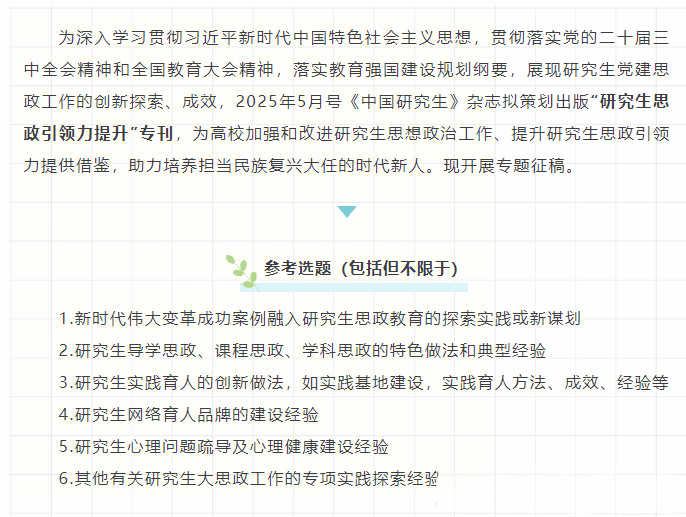 期刊征稿 | “研究生思政引领力提升”专题征稿