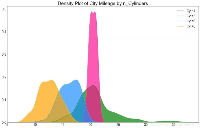 密度图是一种常用工具,可视化连续变量的分布。通过“响应”变量对它们进行分组,您可以检查X和Y之间的关系。以下情况,如果出于代表性目的来描述城市里程的分布如何随着汽缸数的变化而变化。