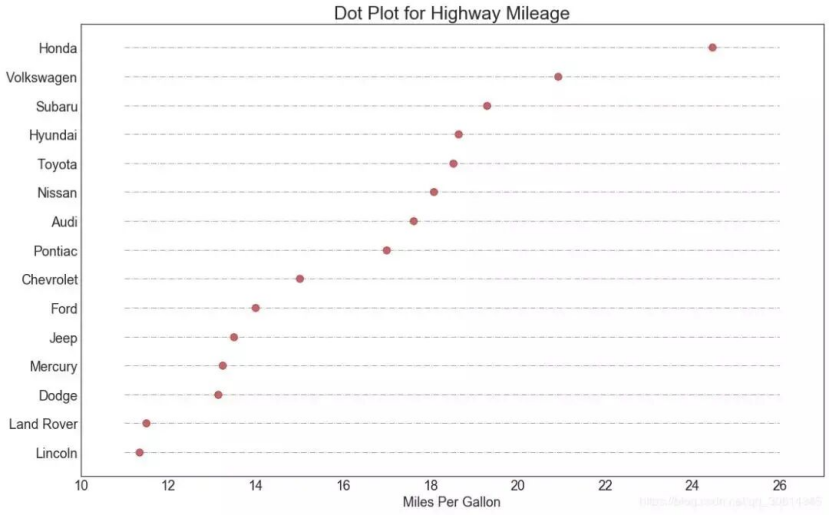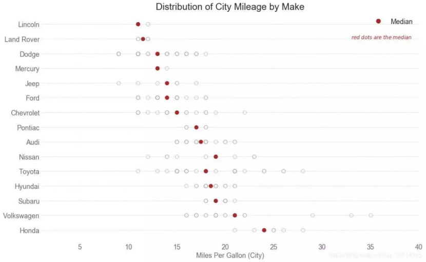 ax.scatter(y=i, x='cty', data=df_median.loc[df_median.index==make, :], s=75, c='firebrick')