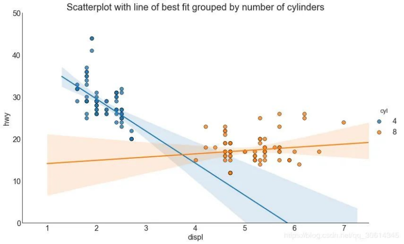 如果你想了解两个变量如何相互改变,那么最合适的线就是要走的路。下图显示了数据中各组之间最佳拟合线的差异。要禁用分组并仅为整个数据集绘制一条最佳拟合线,请从下面的调用中删除该参数。