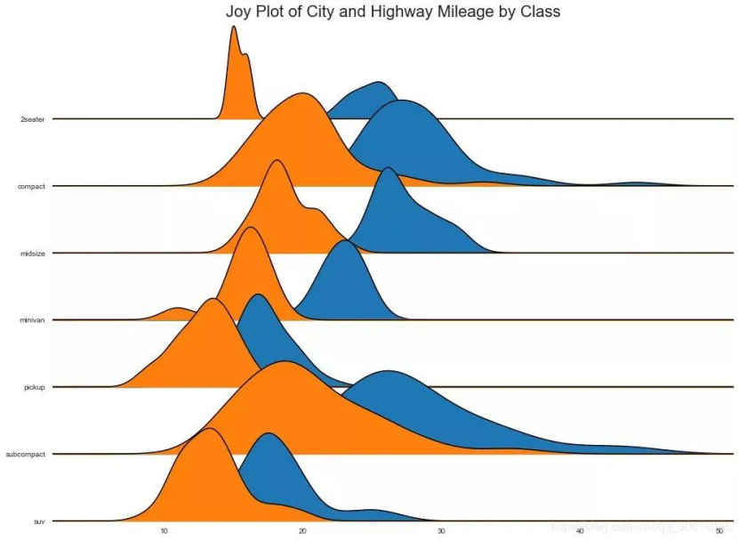Joy Plot允许不同组的密度曲线重叠,这是一种可视化相对于彼此的大量组的分布的好方法。它看起来很悦目,并清楚地传达了正确的信息。它可以使用joypy基于的包来轻松构建matplotlib。