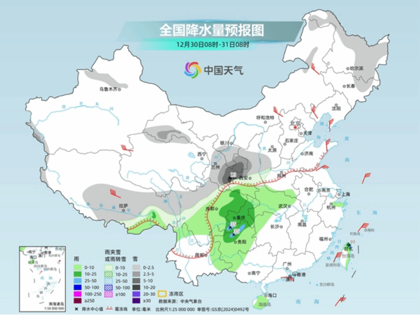 除了降温,冷空气还将带来大范围雨雪天气。随着冷空气南下与暖湿气流交汇,今天至2026年1月1日,中东部将现大范围雨雪,陕西中南部、山西南部、河南西部、湖北西部部分高海拔地区有大雪或暴雪,最强降雪时段为2025年12月31日至2026年1月1日早晨。