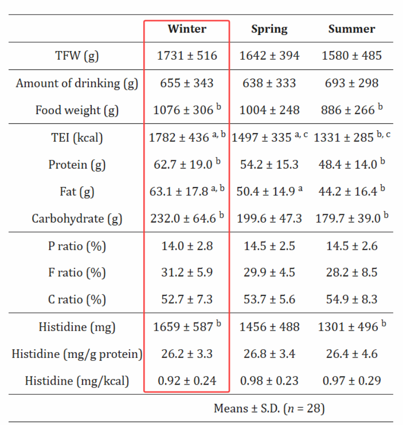 其次,能量摄入和活动量的黄金交叉。冬季摄入多,春季摄入少,这一点也是有相关研究支持的,比如研究人员对不同季节人们摄入热量进行了研究,发现冬季摄入是最高的,无论是摄入食物的总重量(TFW,1731g),还是摄入食物的总热量(TEI,1782kcal),甚至冬季我们的饮食结构中,脂肪摄入占比都要比其他季节更高(F,31.2%)【4】