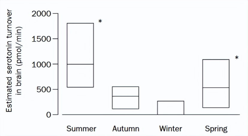 有意思的是,血清素是和日照密切相关的(r=0.294,p=0.010),比如著名医学期刊《柳叶刀》上就有这样一篇关于血清素和季节的研究,研究发现,血清素周转率在冬季是最低的,而随着光照强度增加,血清素生成率开始快速增加【3】。