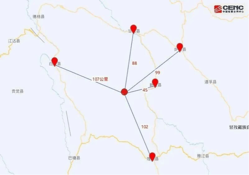 震中距新龙县45公里、距甘孜县88公里、距炉霍县99公里、距理塘县102公里、距白玉县107公里,距甘孜藏族自治州220公里,距成都市404公里。震中5公里范围内平均海拔约4251米。