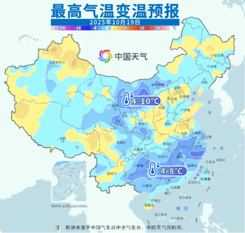 随着冷空气继续南下,降温重点转移到南方,贵州、湖南、江西、安徽、浙江、江苏等地出现6℃至14℃的降温。