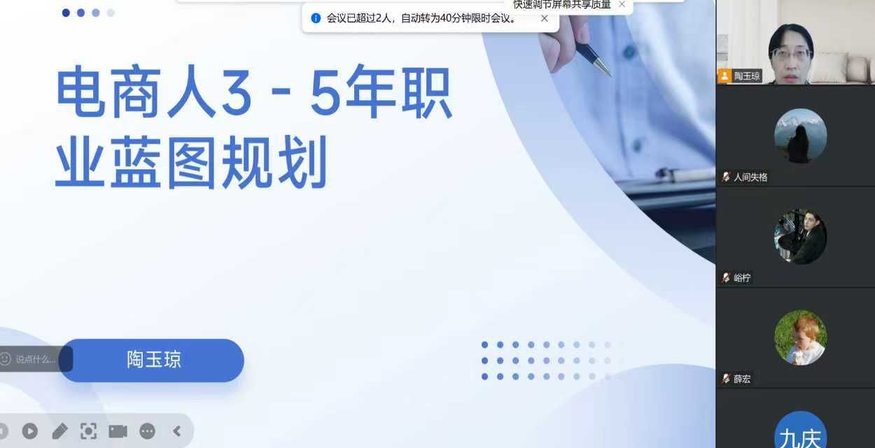 为了更好地服务毕业生,助力其职业发展,2025年11月23日上午,电子商务系陶玉琼老师通过线上培训,为近几年毕业并从事电子商务相关工作的80余名学子,带来了一场题为《电商人3-5年职业蓝图规划》的专题培训讲座。本次讲座旨在帮助毕业生破解职业迷茫与瓶颈,清晰规划未来发展的关键路径,把握电商行业发展趋势,增强职业规划意识与能力,明确从事电子商务行业3-5年的职业发展路径,提升应对职场挑战的信心与技能。