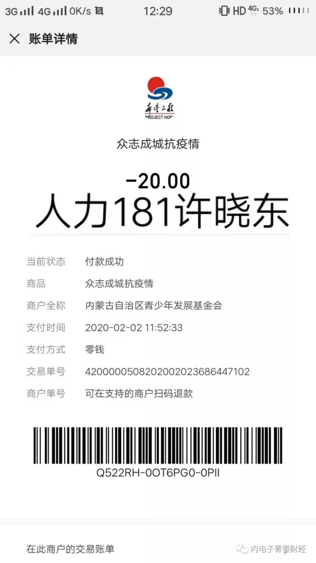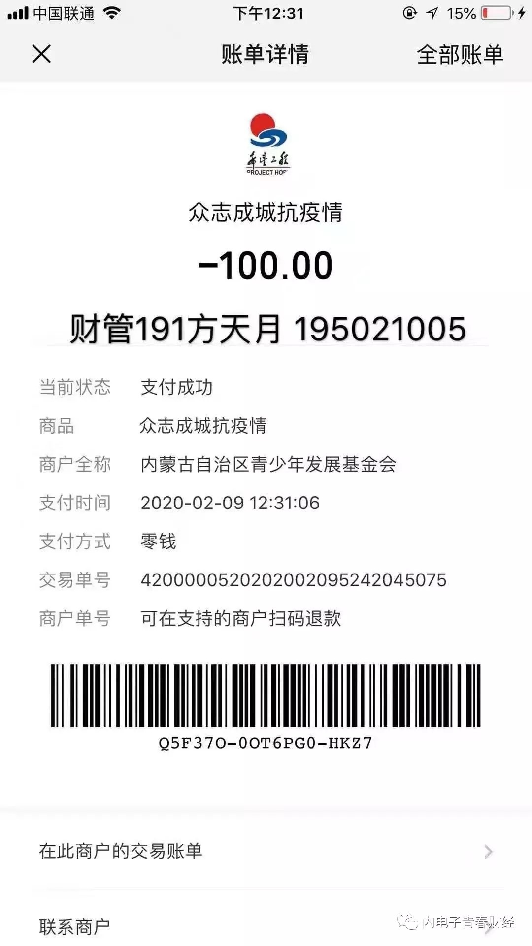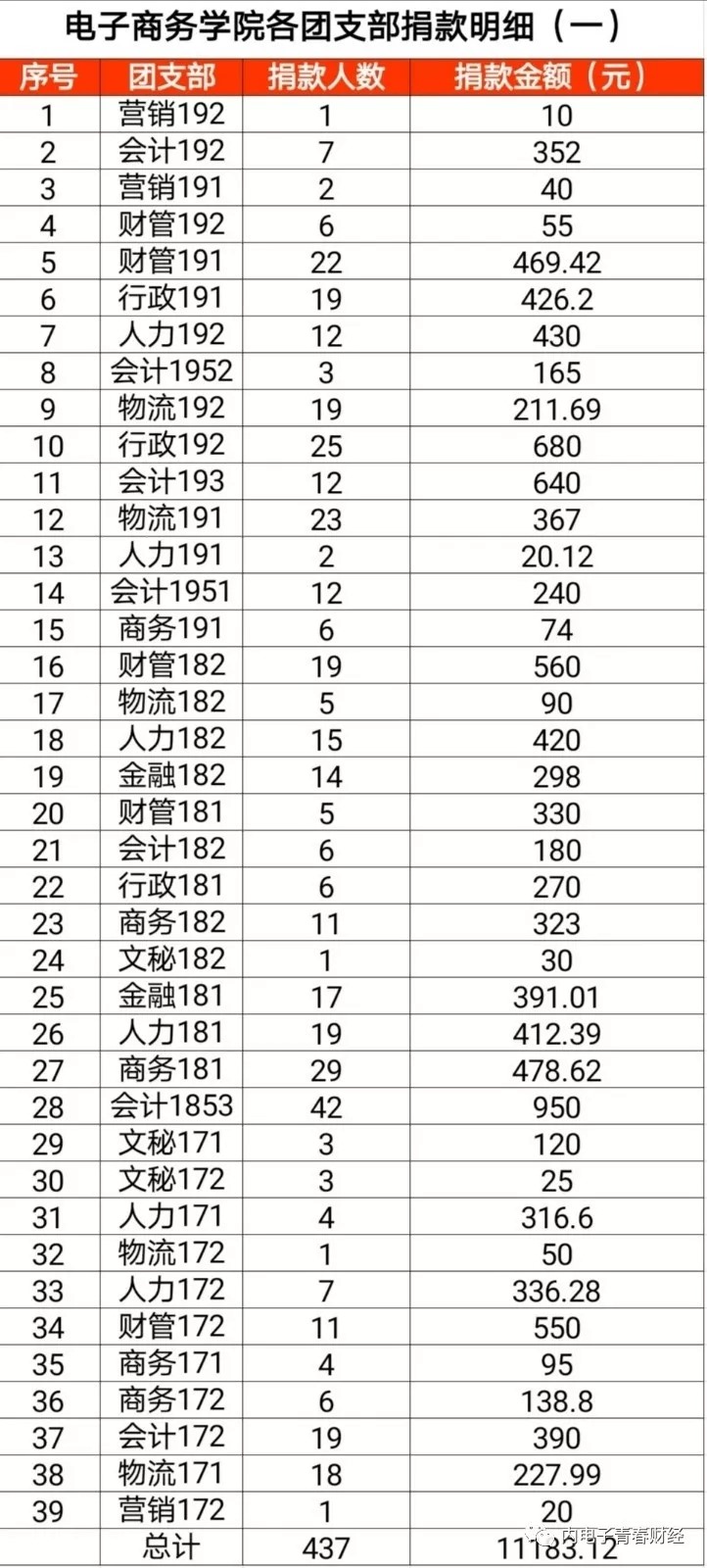 截止2月10日,共有39个团支部437名团学干部、团员青年将抗击疫情防控善款11183.12元人民币,转至内蒙古自治区青少年发展基金会指定账户。现将学院各团支部疫情防控捐款项目明细公示如下: