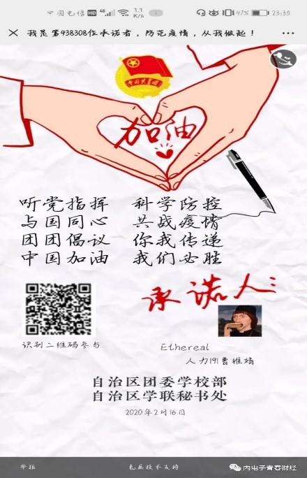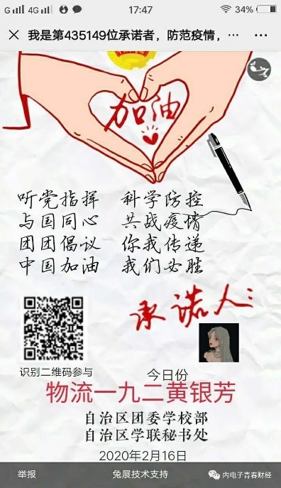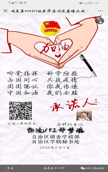 新型冠状病毒感染肺炎疫情的防控工作正处于关键时刻,全国上下众志成城,齐心协力抗击疫情。为坚决打赢疫情防控阻击战,增强全院学生的信心与防范意识。我院在2月14至29日组织全员参与自治区团委学校部、自治区学联秘书处联合发起的“抗击疫情,从我做起,我是北疆大学生,我承诺”网络承诺接力活动。坚决做到严格落实要求,服从指挥,保持联络通畅,不提前返校。通过自己的方式与承诺彰显出当代大学生的责任与担当。