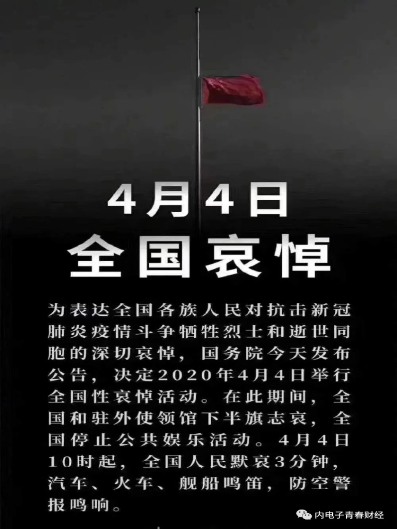在清明节这个特殊的日子里,在抗击疫情这个特殊的时期中,为表达全国各族人民对抗击新冠肺炎疫情斗争牺牲烈士和逝世同胞的深切哀悼,国家决定全国和驻外使领馆下半旗志哀,全国停止公共娱乐活动。