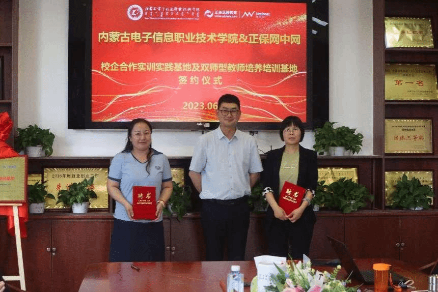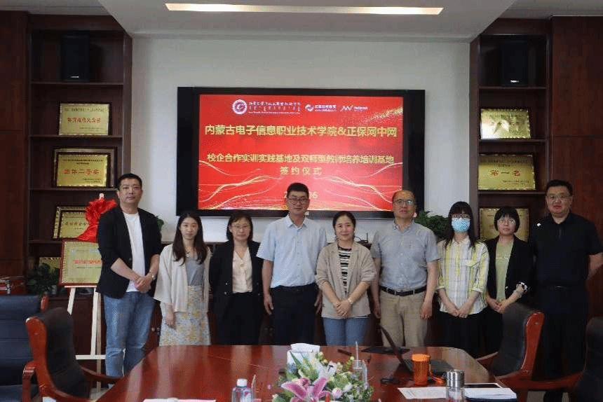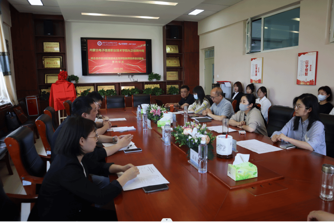 正保集团厦门网中网软件有限公司北区总监张书玮,内蒙古大区经理类彦宁,综合项目部经理郭宜玘,企业培训讲师姜丽宏,电子商务学院党总支书记郑凤、领导班子全体成员、各系主任以及专业教师一起见证了基地的签约成立。