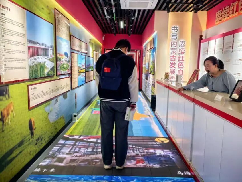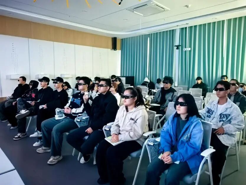 教学过程中,张欣老师围绕"中国共产党领导下的内蒙古革命斗争史"主题进行了系统阐述。蒙古族进步青年于北京蒙藏学校接受马克思主义启蒙、党领导下的大青山抗日游击根据地各族群众坚持武装斗争、内蒙古自治区成立等历史叙事,深深吸引了在场学生。为强化沉浸式教学效果,现场通过三维影像技术呈现《站起来 挺直脊梁》主题影片。学生佩戴专用眼镜,身临其境体验开国大典、中国首颗原子弹研制成功等历史场景,"中国人民从此站起来了"的庄严宣告更显恢弘,有效深化了学生对信仰力量的认知。