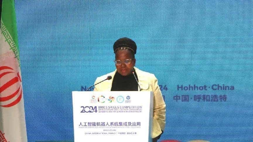 Mapule Ncanywa在闭幕式上致辞。她强调,这场大赛的成功举办,不仅为选手们提供一个展示自我的绝佳平台,也促进国内外不同院校的交流与合作,推动人工智能和机器人领域创新技术的发展。我们看到新的理念在这里碰撞,新的技术在这里展示,新的友谊在这里建立,它将成为我们共同的宝贵财富,激励着更多的年轻人投身于职业教育。