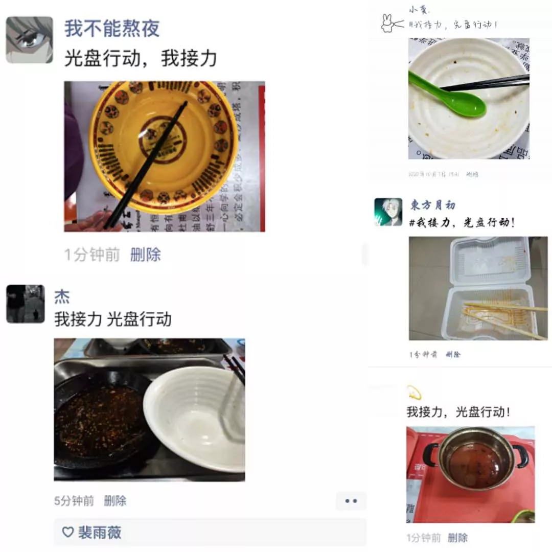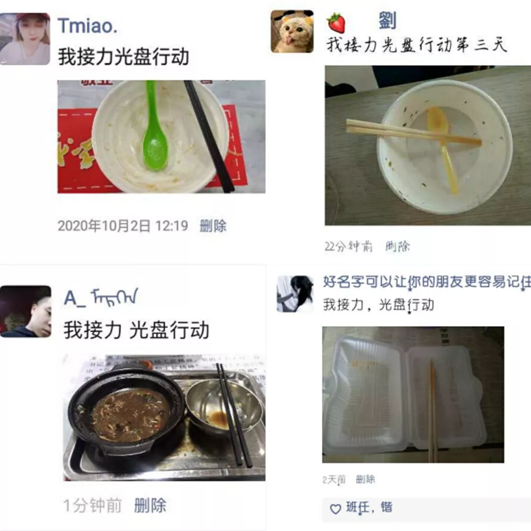 本次活动引导广大团员青年杜绝浪费粮食、制止餐饮浪费,养成节约习惯,传承中华美德,营造“浪费可耻、节约光荣”的良好氛围,各班学生积极的在微信朋友圈进行连续三天的光盘行动打卡。