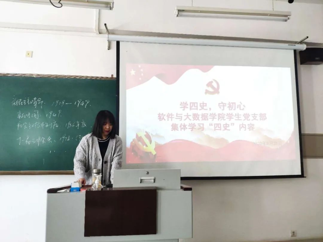 为深入贯彻习近平总书记关于开展“四史”学习的重要指示精神,进一步加强党员的思想教育,弘扬爱国主义精神,持续深化“四史”教育,软件与大数据学院学生党支部于9月24日下午在A110教室集体学习“四史”。本次学习由软件与大数据学院学生党支部书记李茜雯担任主讲人,学生党支部全体党员到场参加。