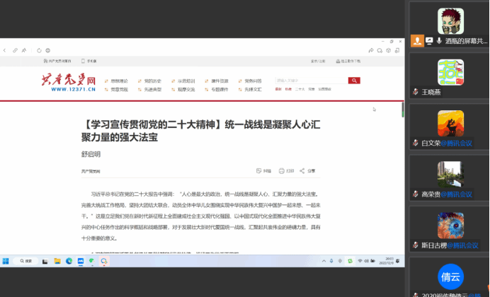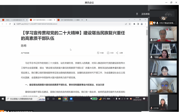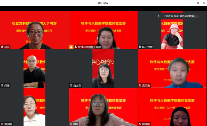 为深入学习宣传贯彻党的二十大精神,引导广大党员干部进一步理解把握党的二十大精神的深刻内涵和精神实质,切实把学习成果转化为促进学校教育事业全面发展的具体举措和实际成效,12月6日-10日每晚上8:00,软件与大数据学院教师党支部开展线上“读书班”学习活动,全体党员教师积极参与。