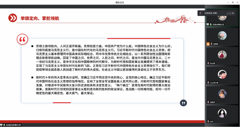 最后,吴昊老师强调身为党员的我们要更加紧密地团结在习近平同志为核心的党中央周围,全面贯彻习近平新时代中国特色社会主义思想,深刻领悟“两个确立”的决定性意义,增强“四个意识”、坚定“四个自信”、做到“两个维护”,锚定既定奋斗目标、始终保持清醒坚定、以坚定的决心、信心、恒心,以强大的志气、骨气、底气,始终掌握党和国家事业发展的历史主动,开创历史新的伟业。