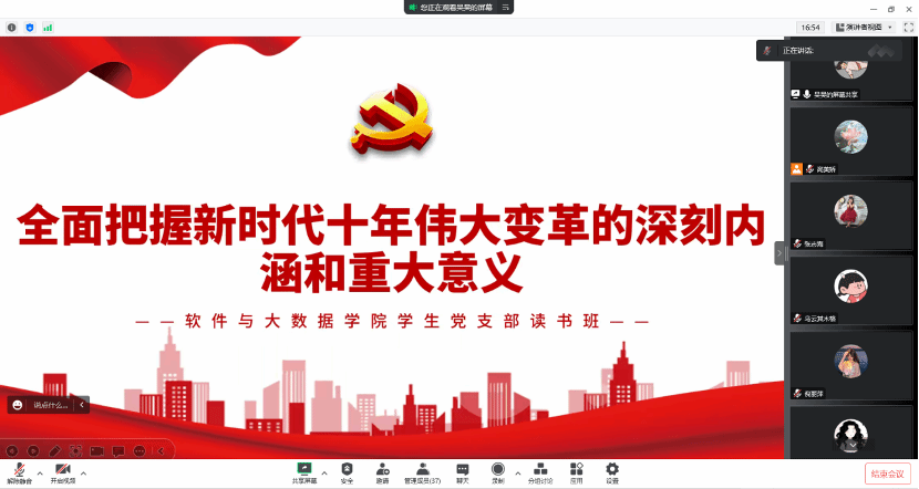 为深入学习宣传党的二十大精神,引导党员干部切实把思想认识统一到党的二十大精神上来,2022年12月6日晚,软件与大数据学院学生党支部于线上召开党的“二十大”精神读书班,学生党支部全体党员共同参会,会议由学院党总支副书记、学生党支部书记张志海老师主持,学生党支部宣传委员吴昊领学。