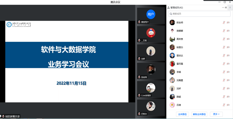 2022年11月15日下午15:00,软件与大数据学院召开了线上教学业务学习会议,会议由教务科科长赵祯主持,全体专兼职和外聘教师参加。
