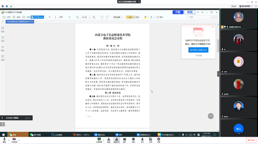 郭娜娜老师领学了《中共内蒙古电子信息职业技术学院委员会关于印发教材委员会章程的通知(内电信院党发〔2022〕34号)》,主要从总则、组织机构、工作职责、委员的权利和义务、议事规程和附则六个方面进行了学习。