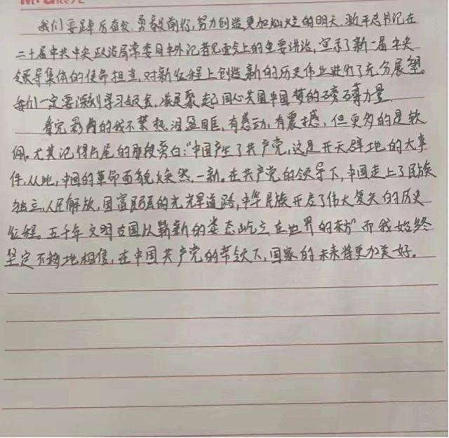 通过线上观看升旗仪式、观影、诗歌朗诵、主题演讲等活动,多位同学发表了自己的心得体会,同学们表示作为新时代的接班人,时刻牢记习近平总书记对青年的殷殷嘱托和谆谆教诲,肩负起历史使命、树立远大理想抱负,努力提高自身素养、调整好自己的心态、摆正好自己的位置,有能吃苦耐劳的精神、有责任感、并且树立终身学习的观念,通过不断的学习来适应社会发展,以实际行动践行二十大精神,为实现中华民族伟大复兴做出自己的贡献。