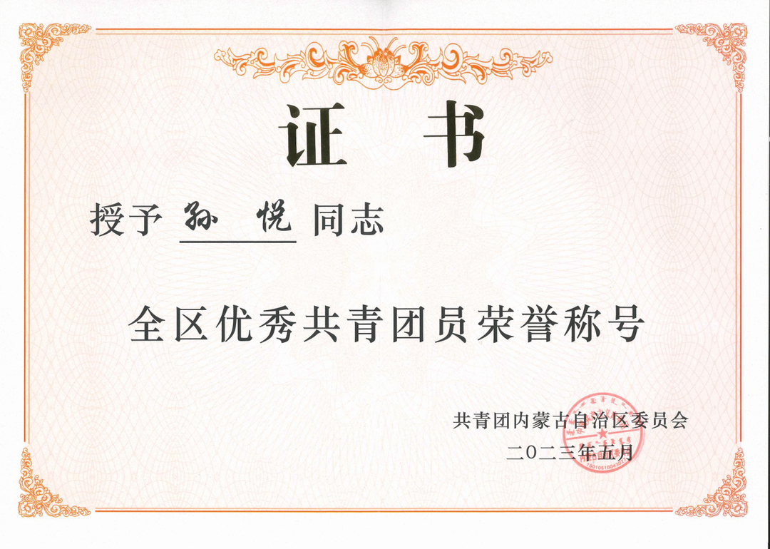 我院2021级大数据技术专业学生孙悦被授予“全区优秀共青团员”荣誉称号。