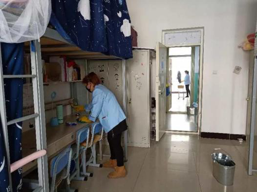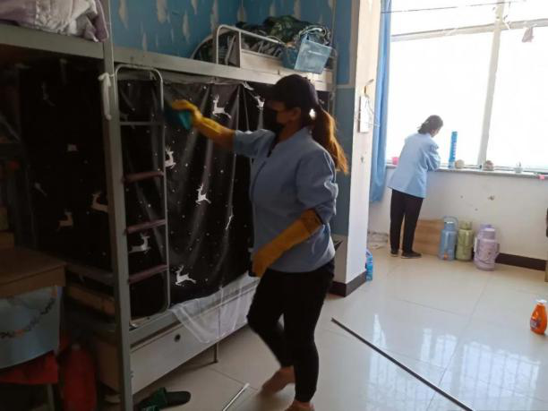 由于长期无人入住,大部分宿舍都积灰严重,尤其是阳台、玻璃、地面,贴心的老师和阿姨们,认真的对每个“小家”开展了卫生清洁行动,并将同学们的被子卷起,清扫灰尘。