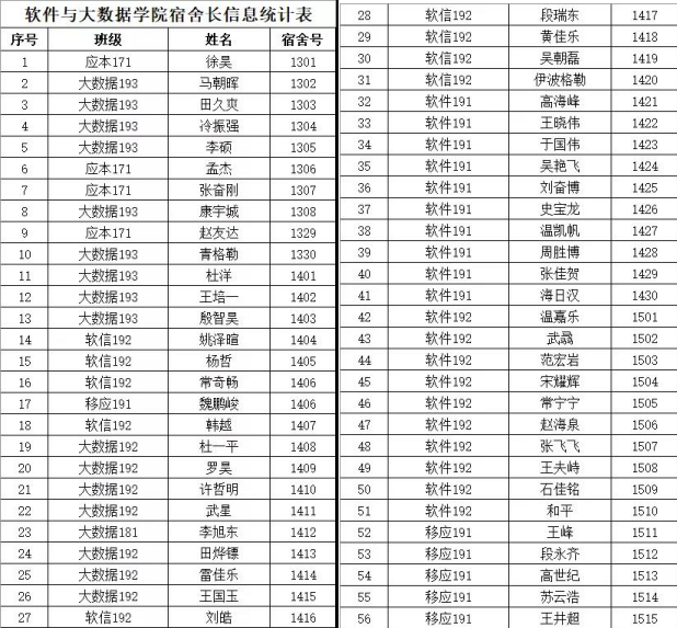 宿舍是学生生活、学习的重要场所,在疫情防控这一特殊时期,宿舍舍长更要率先垂范,带头遵守学校关于防疫工作的有关规定,积极主动配合辅导员和班主任开展的各项工作,引导宿舍同学养成良好卫生习惯。根据内蒙古电子信息职业技术学院疫情防控工作总体要求,软件与大数据学院对各宿舍人员进行调整,现将调整后的宿舍舍长名单公示如下,希望下列同学能够勇于承担责任,充分发挥奉献精神,同心协力为我校疫情防控工作贡献自己的一份力量。