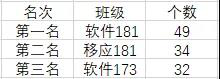 经过三天激烈的比赛,最后,软件181班级以49个的成绩取得了第一名,移应181和软件173紧随其后,最终分别以34个,32个位列第二和第三。