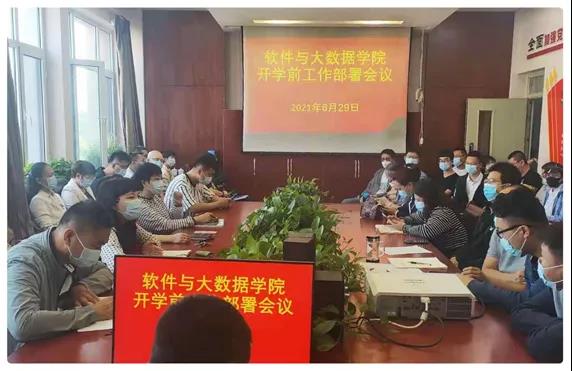 为确保我院2021-2022学年第一学期教学工作有序开展,按照教务处《关于做好2021-2022学年第一学期开学前教学准备工作的通知》(以下简称文件)要求,8月29日上午9点30分在教学楼A座201室,召开疫情防控暨2021年秋季开学工作部署会议,就贯彻落实近期学校疫情防控工作要求,做好2021年秋季学期开学教学和学生管理工作作出部署。会议由副院长白文荣主持,软件与大数据学院全体教职工、外聘教师、校内聘任教师参加会议。