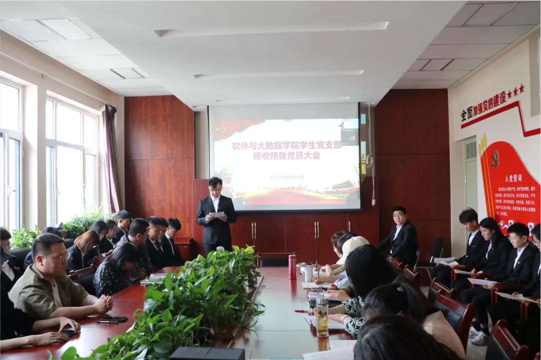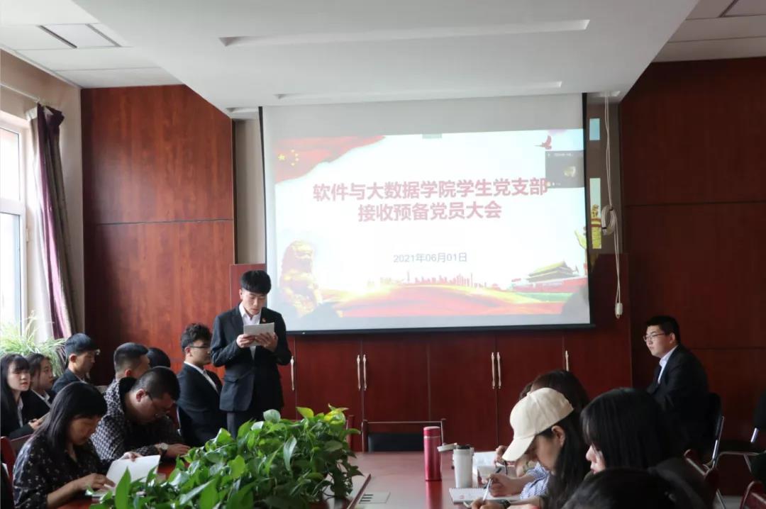 百年光辉历程,百年丰功伟绩,2021年是中国共产党成立100周年,为响应党的号召,进一步加强和推进党员队伍建设,保持党员队伍的生机与活力,培养优秀党员,软件与大数据学院学生党支部于6月1日16:00在教学楼A201会议室召开接收预备党员大会。本次会议由学生党支部书记李茜雯主持,会议采取线上线下相结合的形式召开,学生党支部全体正式党员及38名发展对象参会。