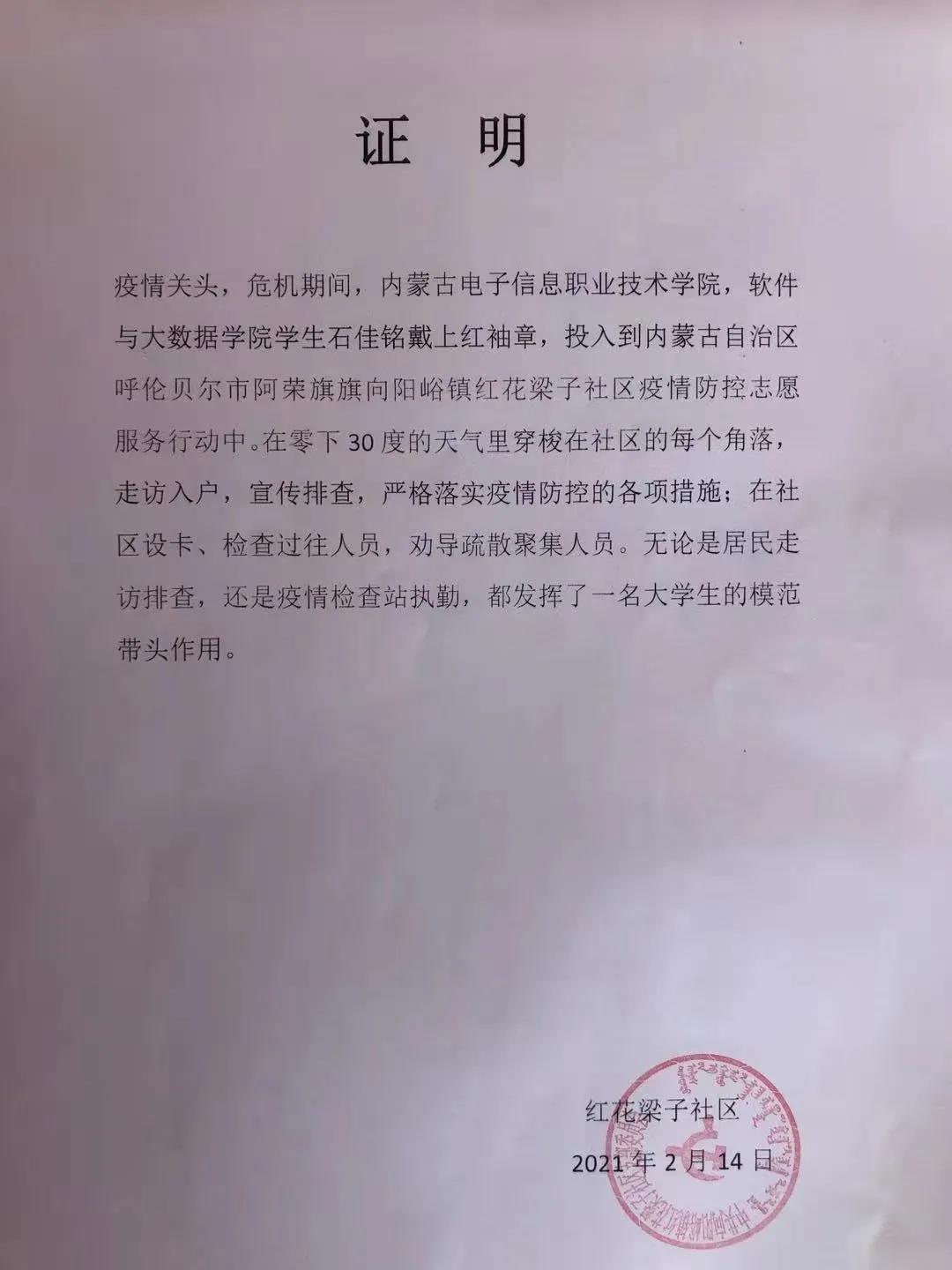 我是内蒙古电子信息职业技术学院软件192班的学生石佳铭。疫情周而复始,身为新时代时期当代大学生,又是一名入党积极分子,我积极的投身到我们社区的疫情防控小组,作为志愿者,在加强自身防护的情况下,参与了自己身处的社区的清洁消毒工作,以实际行动向周围的群众普及健康防疫的知识。跟随社区基层党组织,按照上级组织机关的要求,参与走访了社区住户,调查情况,并普及防疫知识,协助测量体温、宣传防控思想,检查过往人员等活动,从一点一滴的小事做起万众一心,没有翻不过的山,心手相牵,没有跨不过的坎。
