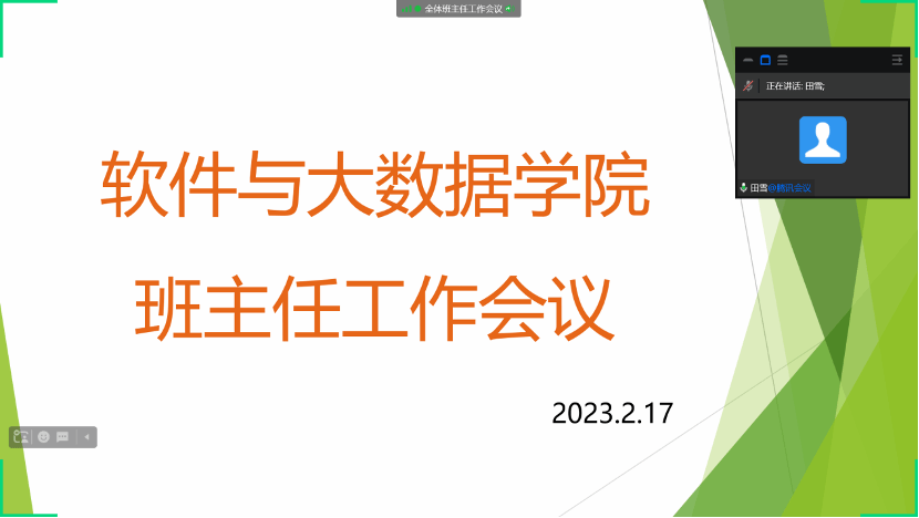 为了切实提高班级管理的效率,确保学生安全有序返校,保障我院学生工作的正常有序开展,2月17日,软件与大数据学院组织召开开学前班主任工作会议。学院全体班子成员、全体辅导员、班主任参会,副院长田雪主持此次会议。