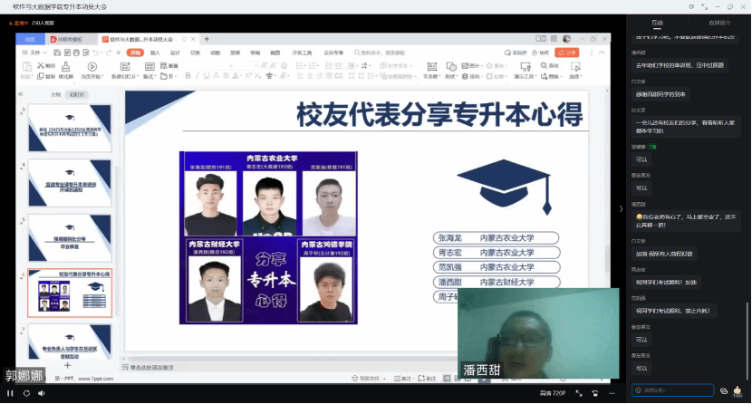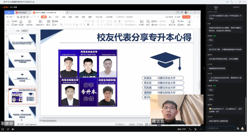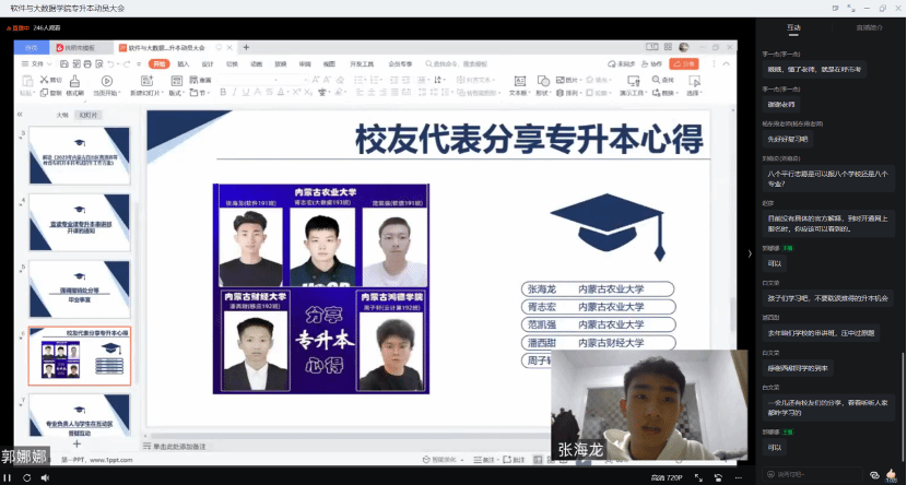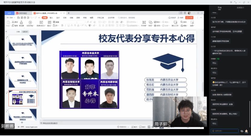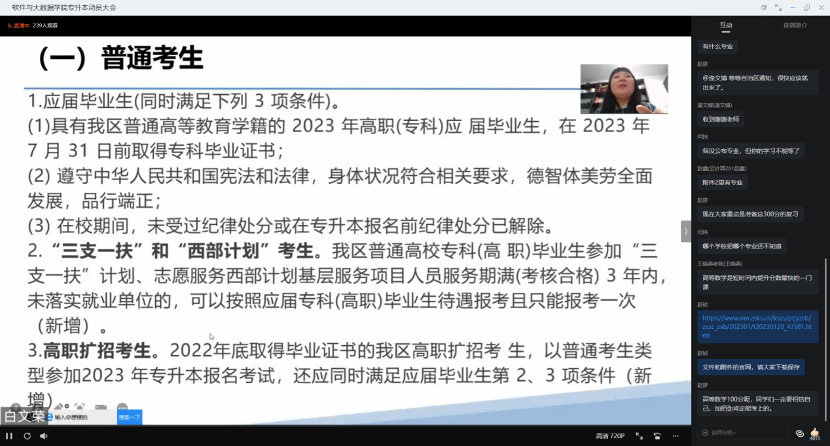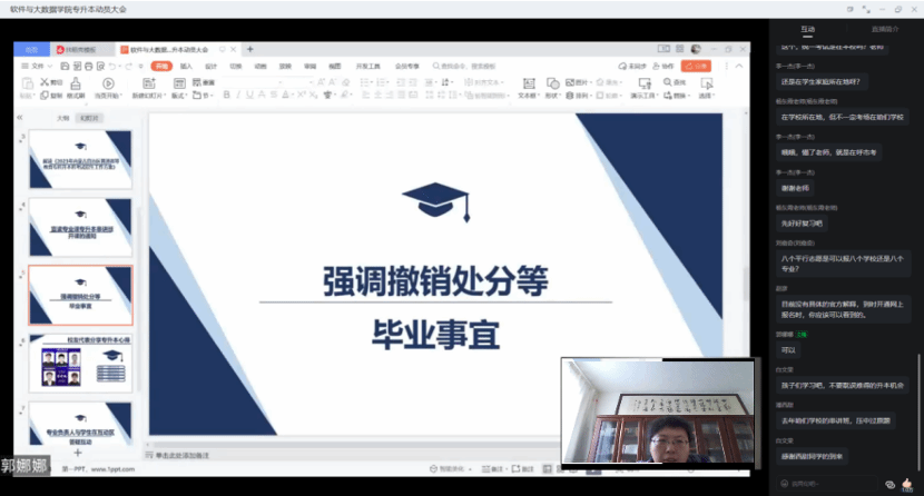 在校友介绍的同时,各专业的专业负责人和2023届毕业生在互动区进行交流互动,对学生提出的问题耐心解答,钉钉联播和微信视频号直播观看人数1438人。直播最后,白文荣副院长对专升本工作做了强调,软件与大数据学院已经成立专升本工作专班,负责组织符合报考条件的2023届高职(专科)毕业生专升本报名和资格审核等工作,并做好课程辅导和答疑解惑,同时年前专升本辅导班班主任吕倩老师也组织了预报名的361名学生参加学校的专升本公共基础课辅导班,所以再次希望毕业生要尽快进入角色,针对方案中的考试科目和要求制定计划,把握机会,努力学习。此次毕业生专升本动员大会,不仅对毕业生的专升本有重要的指导意义,也为后续相关工作的开展奠定了基础。
