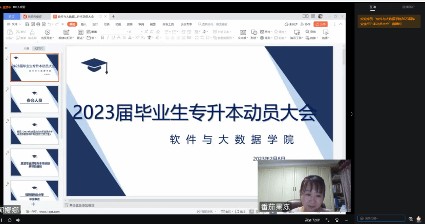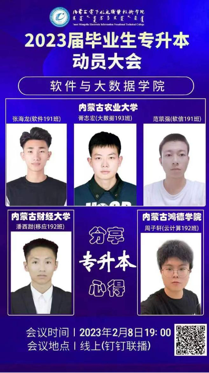 为做好学院2023年专升本工作,2023年2月8日软件与大数据学院通过钉钉群联播的形式开展了2023届毕业生专升本动员直播活动。直播邀请了软件技术专业张海龙、移动应用开发专业潘西甜、软件与信息服务专业范凯强、大数据技术专业胥志宏,云计算技术应用专业周子轩五位优秀校友做专升本经验分享,软件与大数据学院全体教师、班主任以及全体23届毕业生参加。