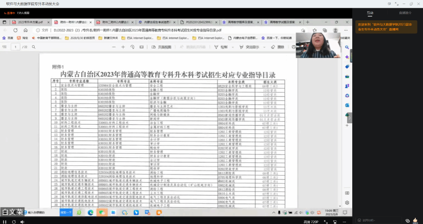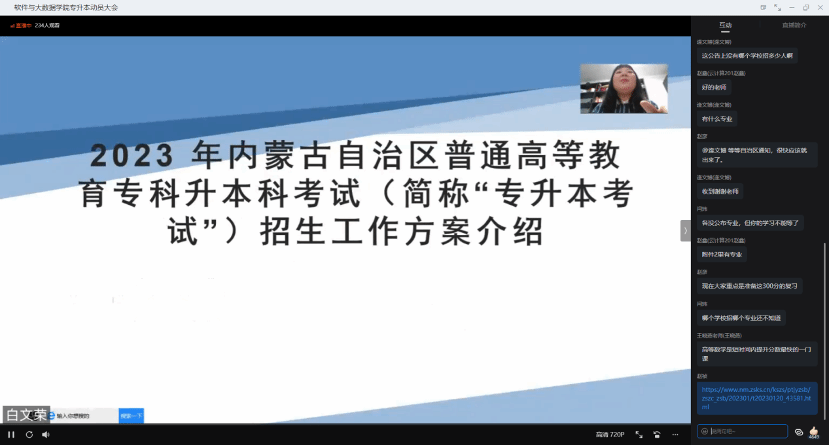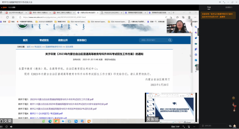 直播开始,白文荣副院长解读了《2023年内蒙古自治区普通高等教育专科升本科考试招生工作方案》,分别介绍了招生方式、招生院校、招生计划、报名条件、招生专业、学制、工作安排,尤其是对今年专升本工作方案较去年的变化做了强调,提醒大家关注招生专业指导目录和考试科目要求并提前做好准备。