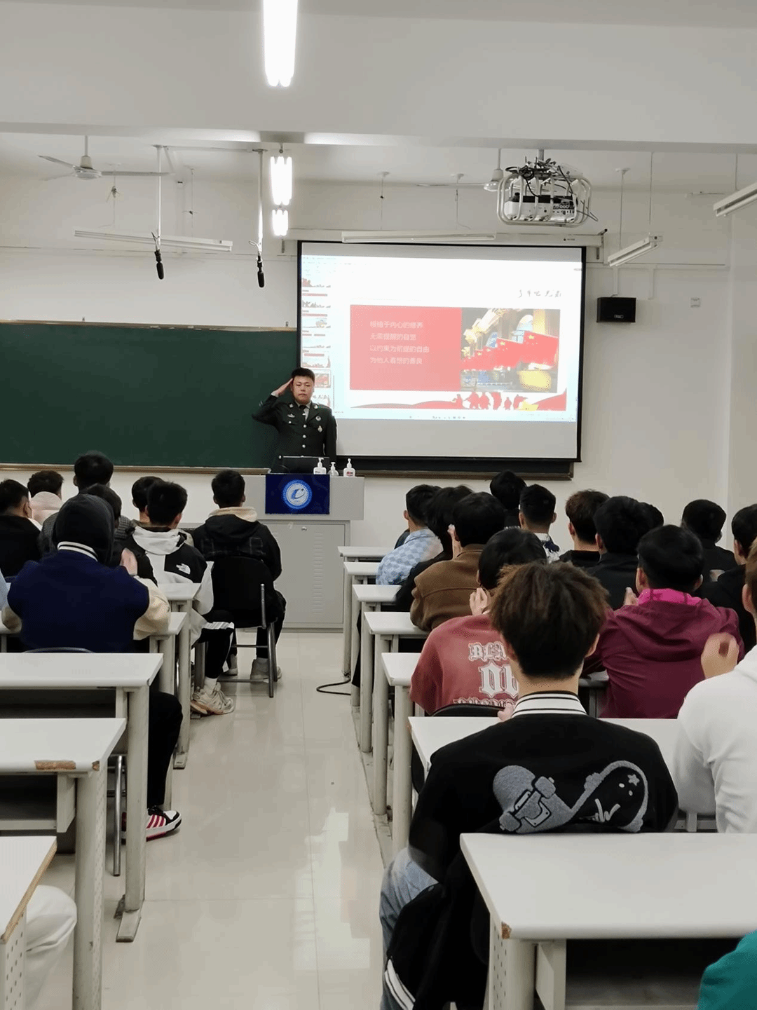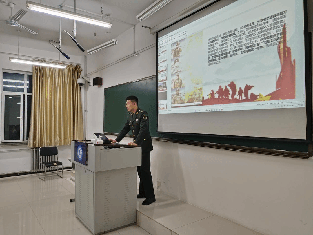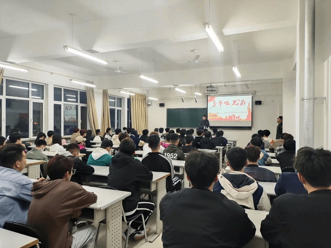 宣讲会开始由主管征兵工作的辅导员刘嘉晨老师进行应征入伍相关政策的解读,就同学们所关心的士兵提干、学费补偿、专科升本及退役安置等事项进行了详细解答。他表示,作为新时代的青年大学生,生逢其时、重任在肩,理应挑起建设国防的大梁,这是历史赋予青年一代的使命和责任。