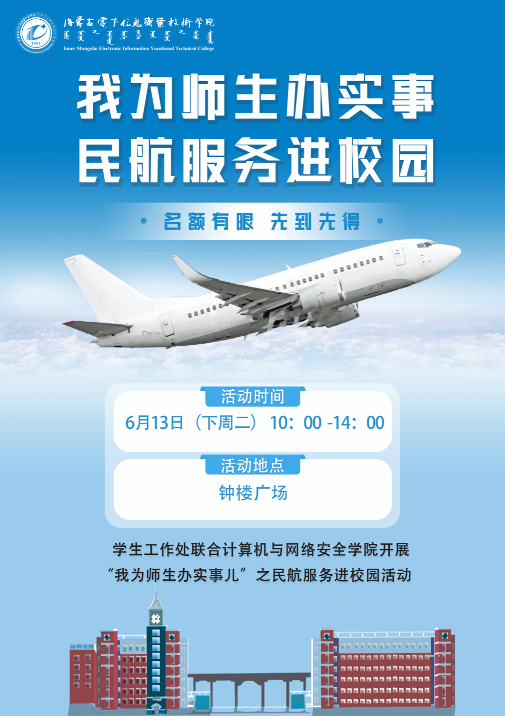 根据《关于合作开展“民航服务进校园”--暑期高校学子助飞计划的函》文件精神,结合我校主题教育具体实际,学生工作处联合计算机与网络安全学院与呼和浩特机场公司合作开展【“我为师生办实事儿”之民航服务进校园活动】。