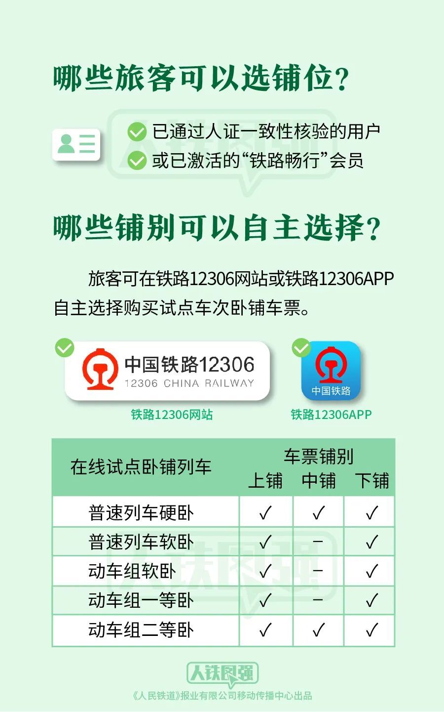 此前,旅客在铁路车站售票窗口、代售点等线下渠道购买卧铺车票可选择铺别,在12306网站购买卧铺车票由系统自动分配铺位。在线选铺服务推出后↓