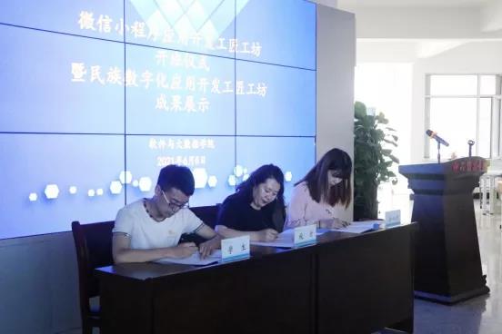为进一步促进产教融合,校企合作,践行“理实一体 虚实结合 工匠工坊”的人才培养模式,6月8日下午,软件与大数据学院在实训楼D座5楼举办了“微信小程序应用开发工匠工坊”开班仪式暨“民族数字化应用开发工匠工坊”成果展示活动