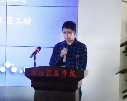 微信小程序应用开发工匠工坊工程师刘嘉伟发言,向同学们介绍了工坊的具体学习内容,项目案例,同时对同学们提出了需要遵守的工坊相关要求、规定,督促同学们多多相互学习,相互促进,学会反思,学会分享,共同提高。
