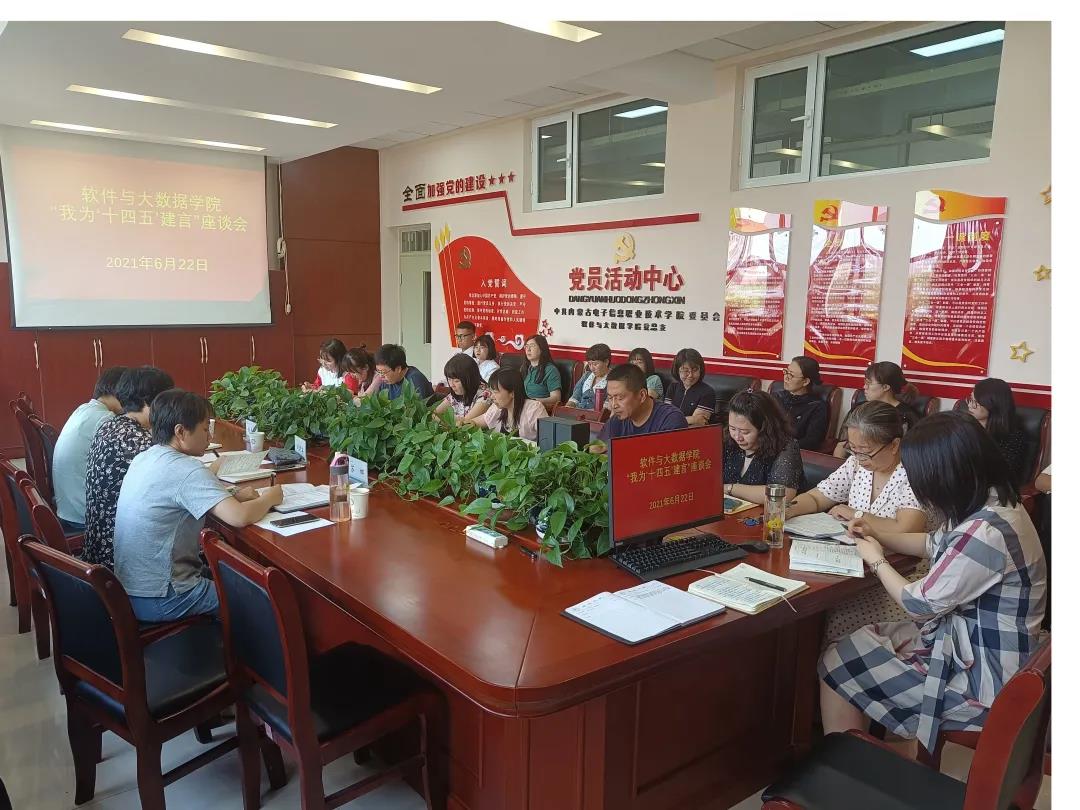 2021年6月22日,软件与大数据学院召开了“我为‘十四五’建言”座谈会,学校党委委员、纪委书记刘建英,科技处副处长张青辉,科技处综合管理科科长苏娜出席座谈会。软件与大数据学院全体副科级以上干部、高级职称教师、学生代表,参加座谈会。党总支书记杨志敏主持会议。